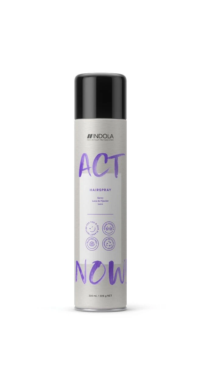 Indola ACT NOW! Hairspray is een siliconenvrije styling fixatiespray en die alle haartypes in model houdt. De spray heeft een extra fijne verneveling en geeft een droge en langdurige fixatie aan het haar met medium hold. De Hairspray is gemakkelijk uit te borstelen en laat geen residuen achter.