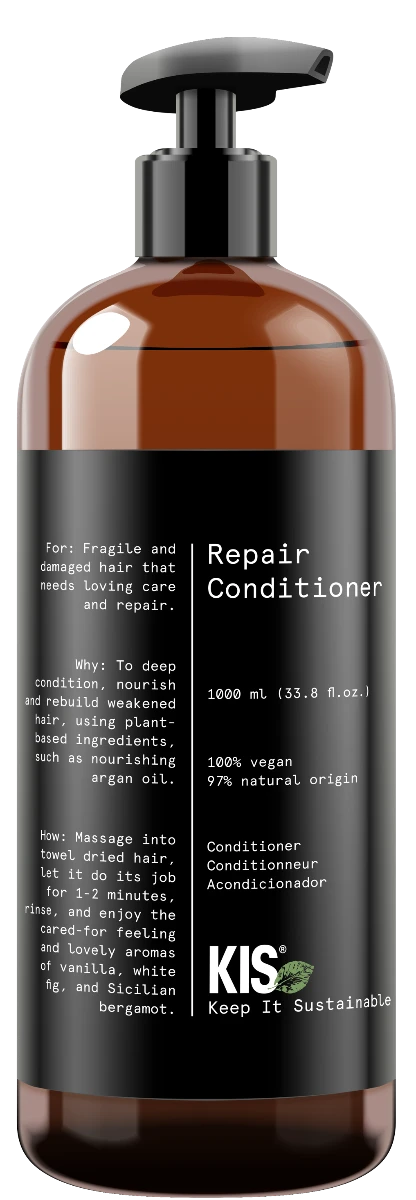 KIS Green Repair Conditioner is verkrijgbaar in 250ml en 1000ml. Ontdek ook de andere lijnen van de veganistische haarverzorgingslijn KIS Green op Haibu: KIS Green Color, Smooth, Volume en Curl.