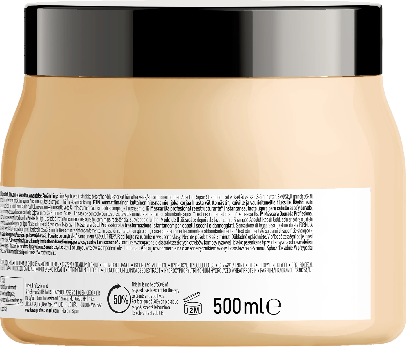 De L’Oréal Serie Expert Absolut Repair Gold Golden Haarmasker 500mlzorgt ervoor dat (zeer) beschadigd haar een boost krijgt. Het haar wordt intensief gevoed en verzorgd. Elke haarvezel wordt afzonderlijk gevoed en gehydrateerd. Het haarmasker laat de haarschubben sluiten en zorgt ervoor dat het haar weer gezond aanvoelt. De L’Oréal Serie Expert Absolut Repair Gold Golden Haarmasker is rijk aan proteïnen en Quinoa.