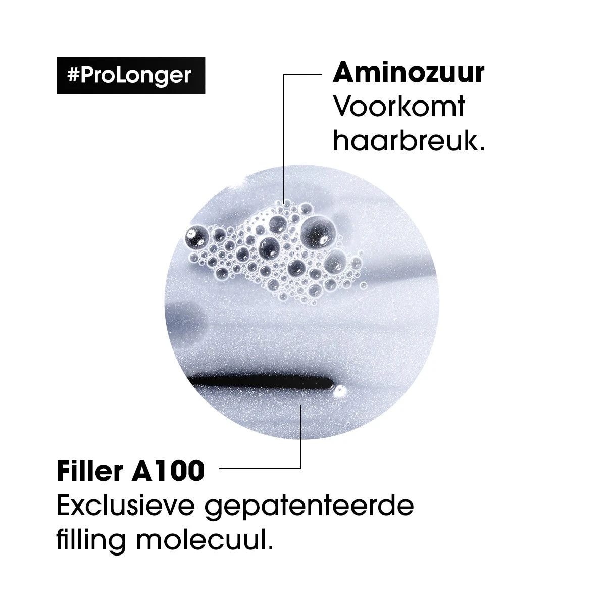 De L’Oréal Serie Expert Pro Longer Shampoo bevat de gepatenteerde technologie met aminozuren en Filler-A100. Aminozuren vernieuwen en versterken het haar waardoor het minder snel breekt. Het gepatenteerde molecuul Filler-A100, dat exclusief eigendom is van L’Oréal, vernieuwt de lengte en vult de uiteinden van het haar van binnenuit op. Het resultaat is gezonder, dikker en perfect lang haar!