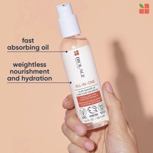 De Matrix Biolage All-in-One Oil is een multifunctionele olie. Deze olie heeft meerdere voordelen voor het haar en is geschikt voor alle haartypes. De formule van de olie is verrijkt met hoogwaardige natuurlijke ingrediënten die het haar diep hydrateren en voeden.