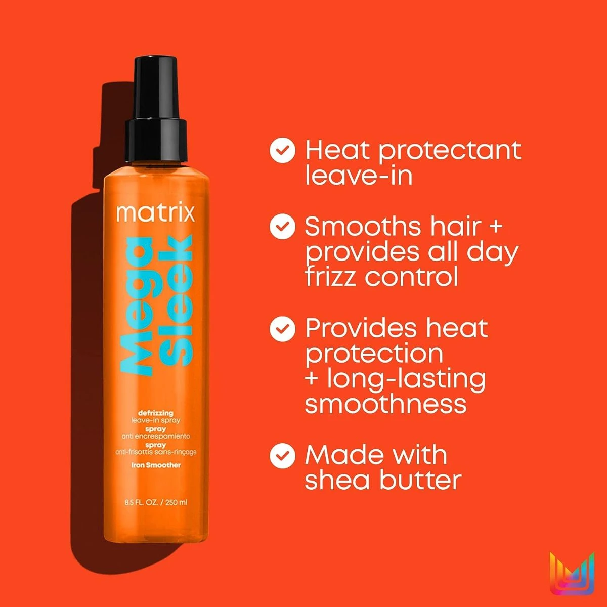 De Matrix Mega Sleek Iron Smoother is een multifunctionele spray. Met de smoother maak je het haar zijdezacht en pluisvrij. Dit krachtige product is jouw geheim voor moeiteloze perfectie, elke dag weer. Ga de strijd aan met hitte tools en vocht, terwijl het haar er gladder en glanzender uitziet dan ooit tevoren.