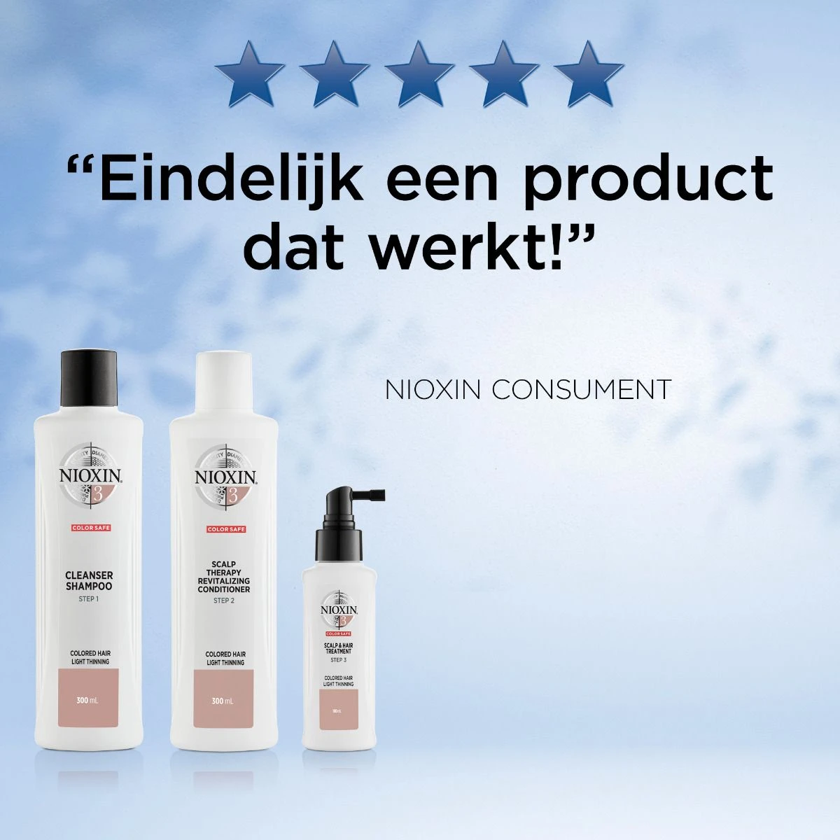 Eens goed het haar en de hoofdhuid reinigen? Nioxin heeft speciale kits die bestaan uit drie verzorgingsproducten in één pakket. In een korte tijd krijg je een kleine haarspa. Nioxin Trial Kit System 3 (dun uitziend haar – chemisch behandeld) is geschikt voor vele haarsoorten, namelijk voor normaal tot dun uitziend haar, fijn haar en gekleurd haar. De set bestaat uit drie producten die stap voor stap gebruikt dienen te worden: – Stap 1: Nioxin System 3 Cleanser. Dit is een shampoo die de vochtbalans reguleert en de hoofdhuid verfrist. Vrij van alcohol, parfum en siliconen. – Stap 2: Nioxin System 3 Scalp Revitaliser. Dit is een conditioner die het haar extra weerstand geeft. Vrij van alcohol, SLS en sulfaten. – Stap 3: Nioxin System 3 Scalp Treatment. Dit is een serum dat de hoofdhuid verzorgt en het haar weer laat stralen. Vrij van SLS en sulfaten.