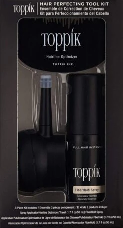 Toppik Hair Perfecting Tool Kit bevat alles wat je nodig hebt om een perfecte look te creëren met de Hair Building Fibers. Gebruik de Spray Applicator, Hairline Optimizer en Fiberhold Spray uit deze set voor een mooie, natuurlijke look die goed blijft zitten.